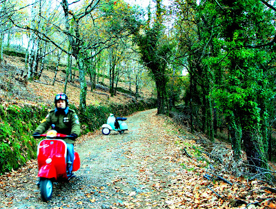 Rumei já tarde pela E.N. que vai de Aveiro a Cantanhede. O Sol aquecia um dia que amanheceu gelado. De Cantanhede a Coimbra foi um saltinho, com o Vespão a queimar minutos a 90Km/h ininterruptamente! Atravessei o Mondego e teria sido presenteado com a Melhor Bifana do Mundo - Mijacão - não fosse o avançado da hora. No Terreiro da Erva encontrei a outra Sprint e depois da bucha, em ritmo lento, procuramos a Estrada da Beira, voltamos à margem Esquerda do Mondego, atravessamos o Rio Ceira e começavam as curvas que ansiavamos; ora uma, ora outra scooter comandavam a cadência de cada curva.